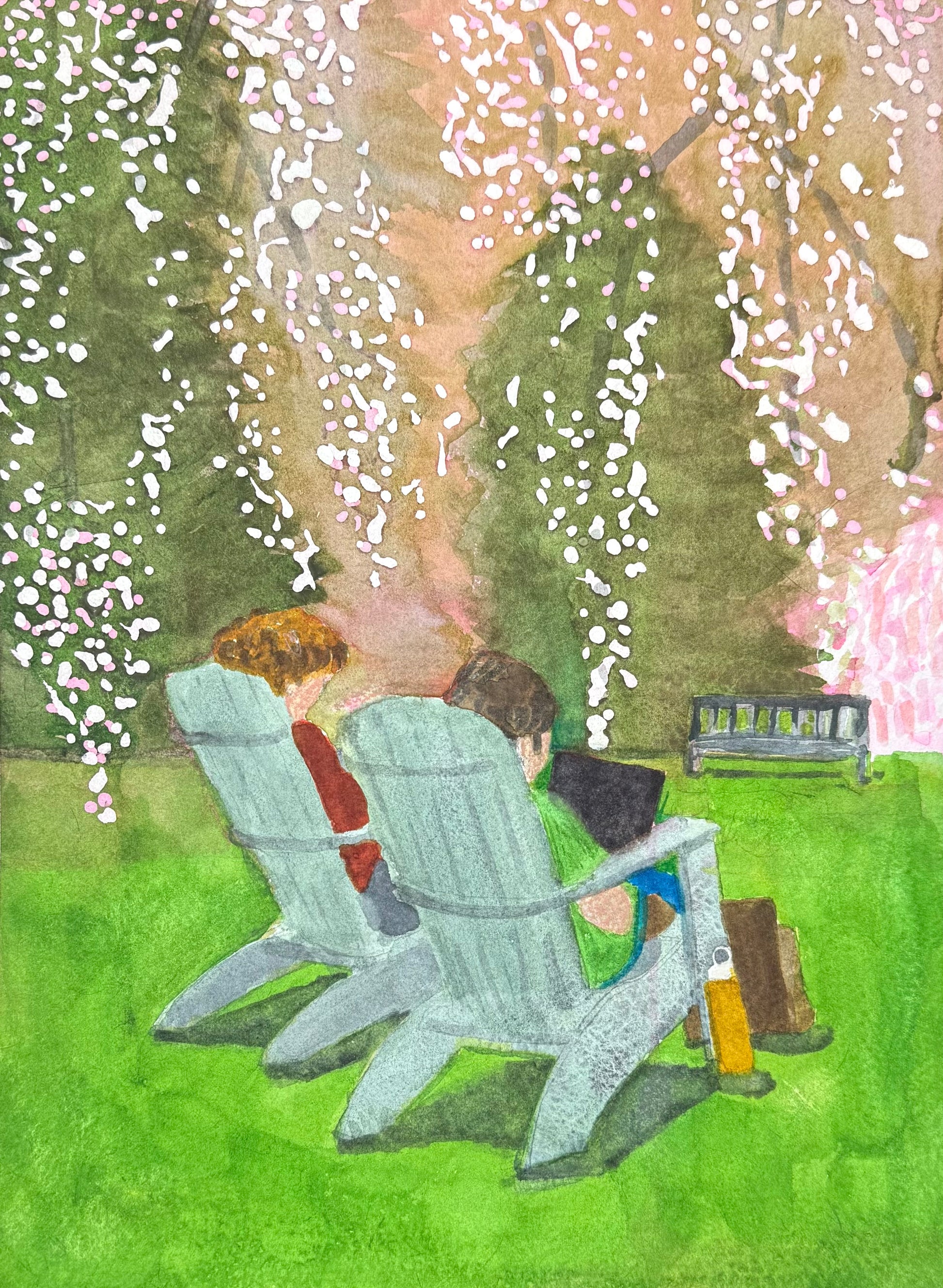 A beautiful spring day with cascading cherry blossoms and two students studying on Adirondack chairs. 9x12”